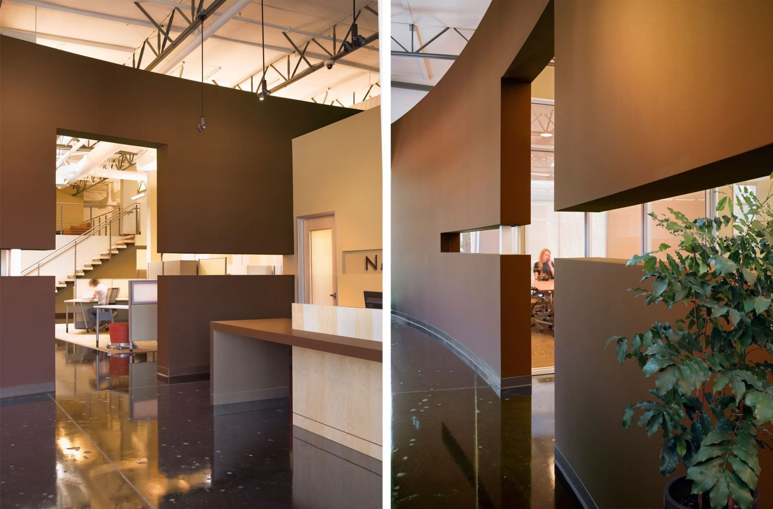 Navajo Company, an advertising and public relations firm serving the growing Silicon Valley high-tech industry, wanted an environment to reflect who they are—a space that is both high-tech, yet warm and inviting. Along with exposed structure, mechanical ducts and lighting, the lobby is enclosed by a sweeping curved wall cut with a narrow slot which provides a glimpse of the room that lies just ahead. The opening reveals the main conference room beyond. On axis to the entry, the view is down an angled wall of offices, with stairs to a new mezzanine beyond. From the conference rooms, selective views out reveal open office furniture and the company’s sign in the entry area beyond. The stainless steel stair with wood treads leads to the mezzanine offices.