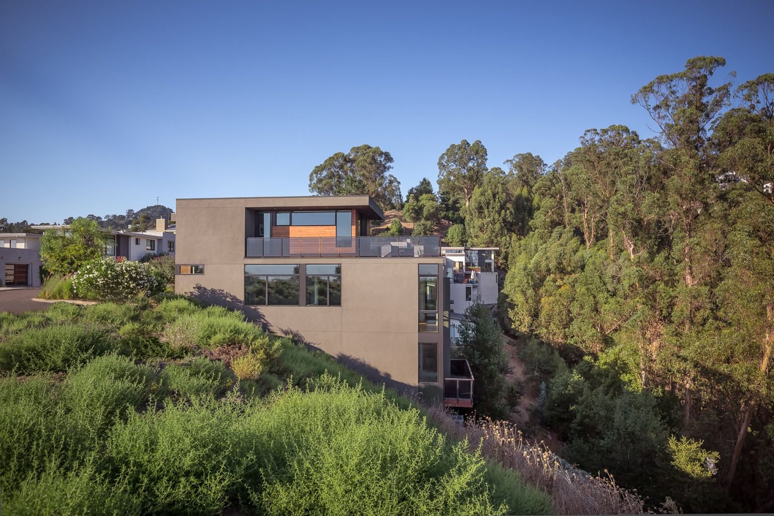 Approached by a developer for his personal residence for the design of a 3,000 square foot residence on a steep downsloping lot in the Oakland hills. A unique development of modern residences Jewel Court is a brand-new community created on top of a knoll in the hills.
