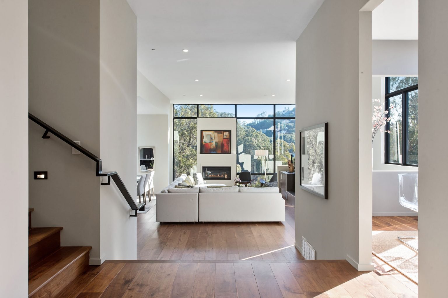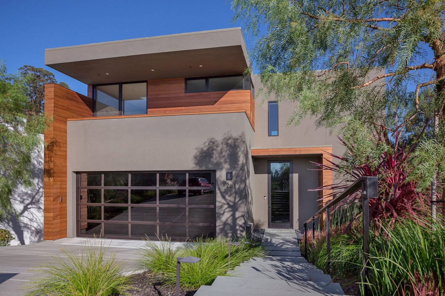 The street façade is a composition of gray stucco and red cedar siding and dark bronze Fleetwood windows and doors. Morf | Chang landscape design has drought-resistant grasses flanking a concrete paver step down to the front entry. Upon arrival the great room frames views of the surrounding hillside forest.